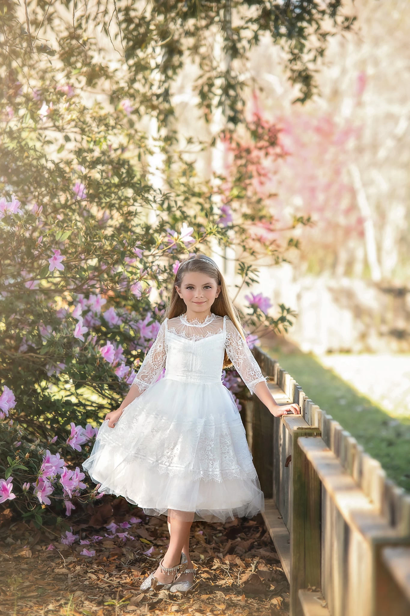 The dress of her dreams! The bodice & sleeves of this dress boast our signature soft-cotton lace, soft tulle yolk and are graced with elegant trimmings. The skirt has layers upon layers of tulle with elegant trims and designs, and a white lining underneath. Truly a keepsake piece! Fully lined with soft cotton. Machine wash, hang dry.Â