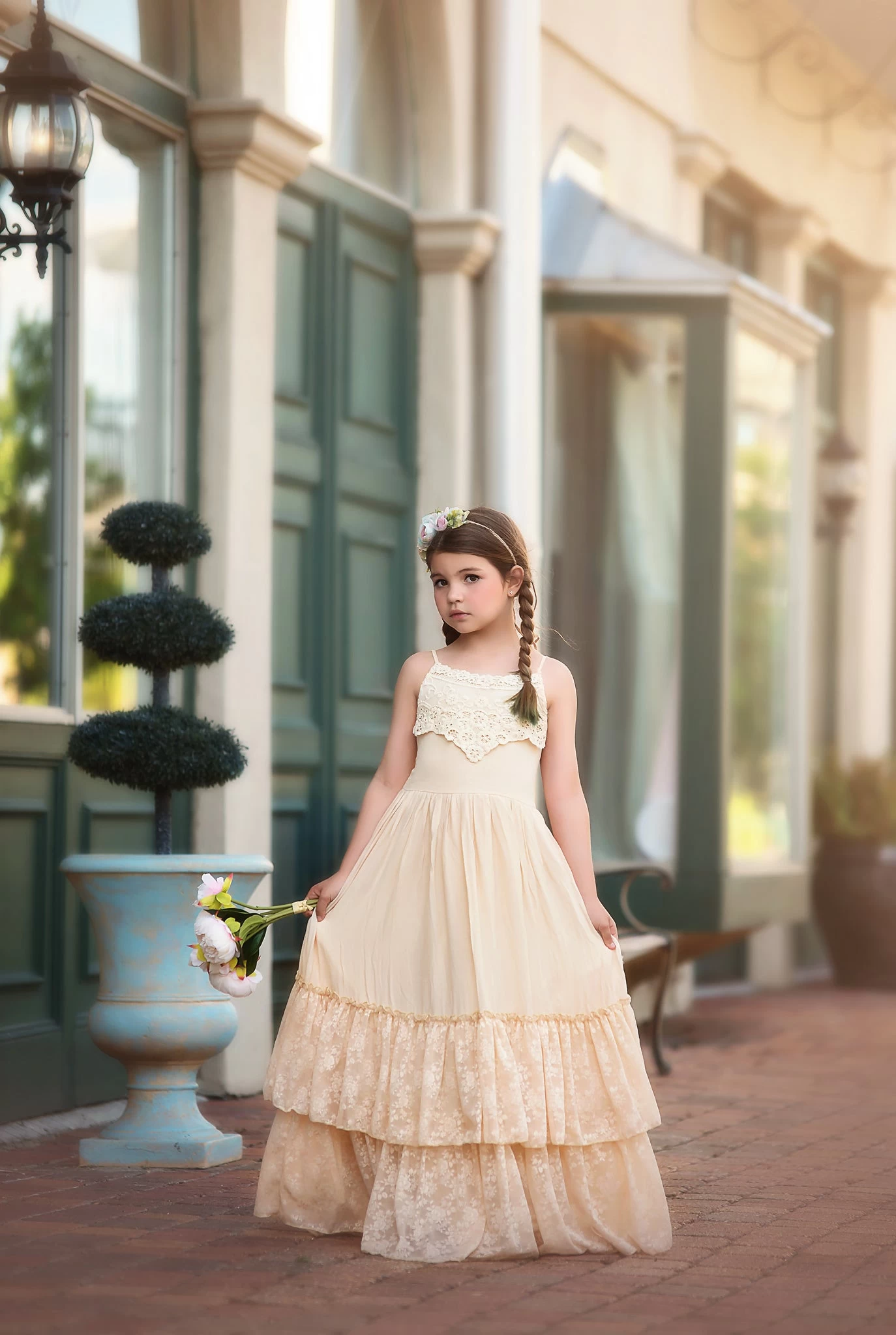 Simply stunning, this gown is just as pretty coming as it is going! This stretch cotton jersey dress will have your girl in a twirl. From the crochet bodice down to the lace ruffled hem, twirl her around to find a sweet tie back, for just the right fit. This soft, stretchy cotton is perfectly comfortable and machine washable.