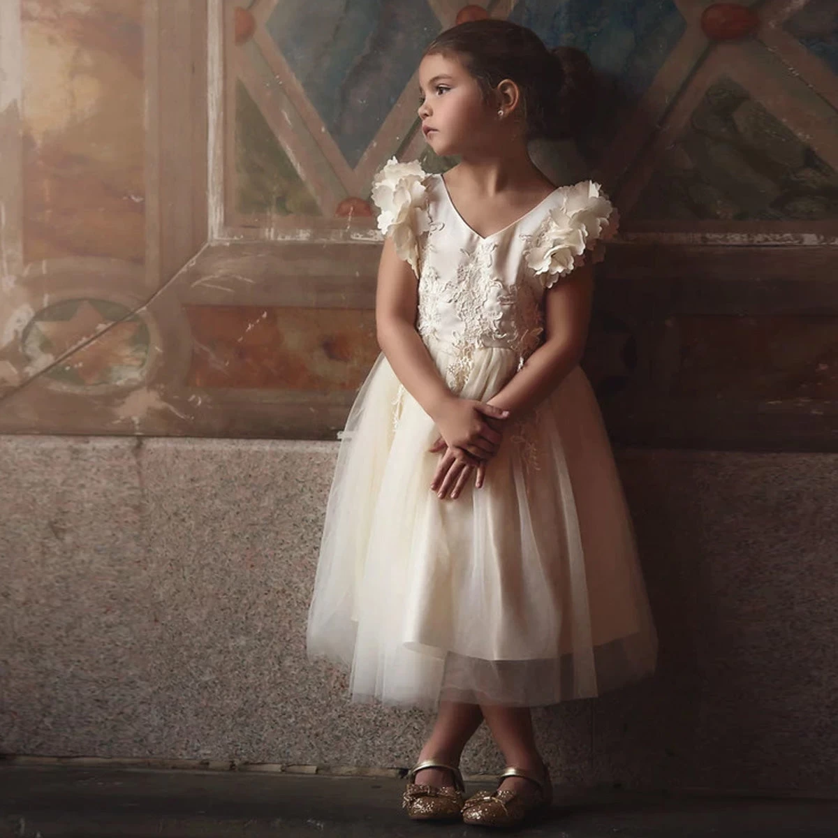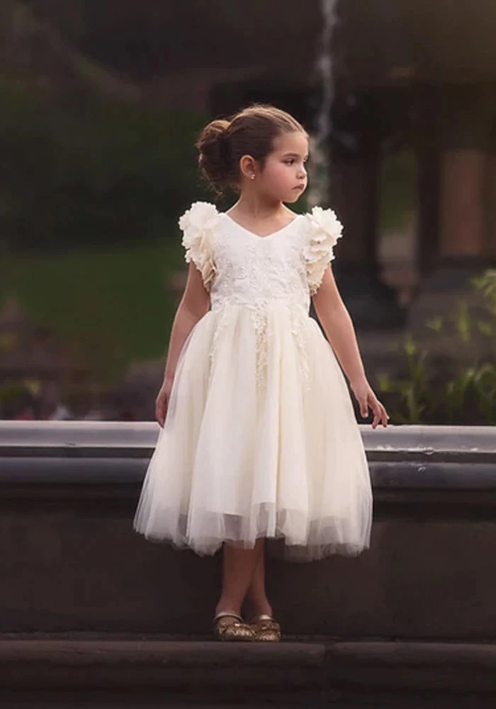 Fit for a princess, this dress has it all. Soft off white satin graced with a touch of lace, this dress is a showstopper! Sleeves are embellished with whimsical die cut flowers that will have all eyes on her. Tulling overlay skirt adds just the right touch of fullness and twirl. Fully lined with soft cotton, back zip. 100% poly self, 100% cotton lining. Machine wash, hang dry.