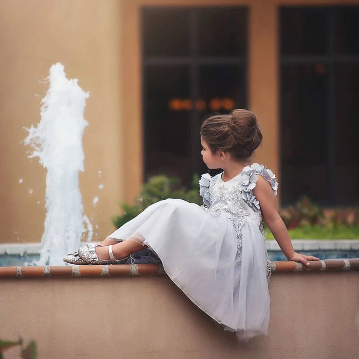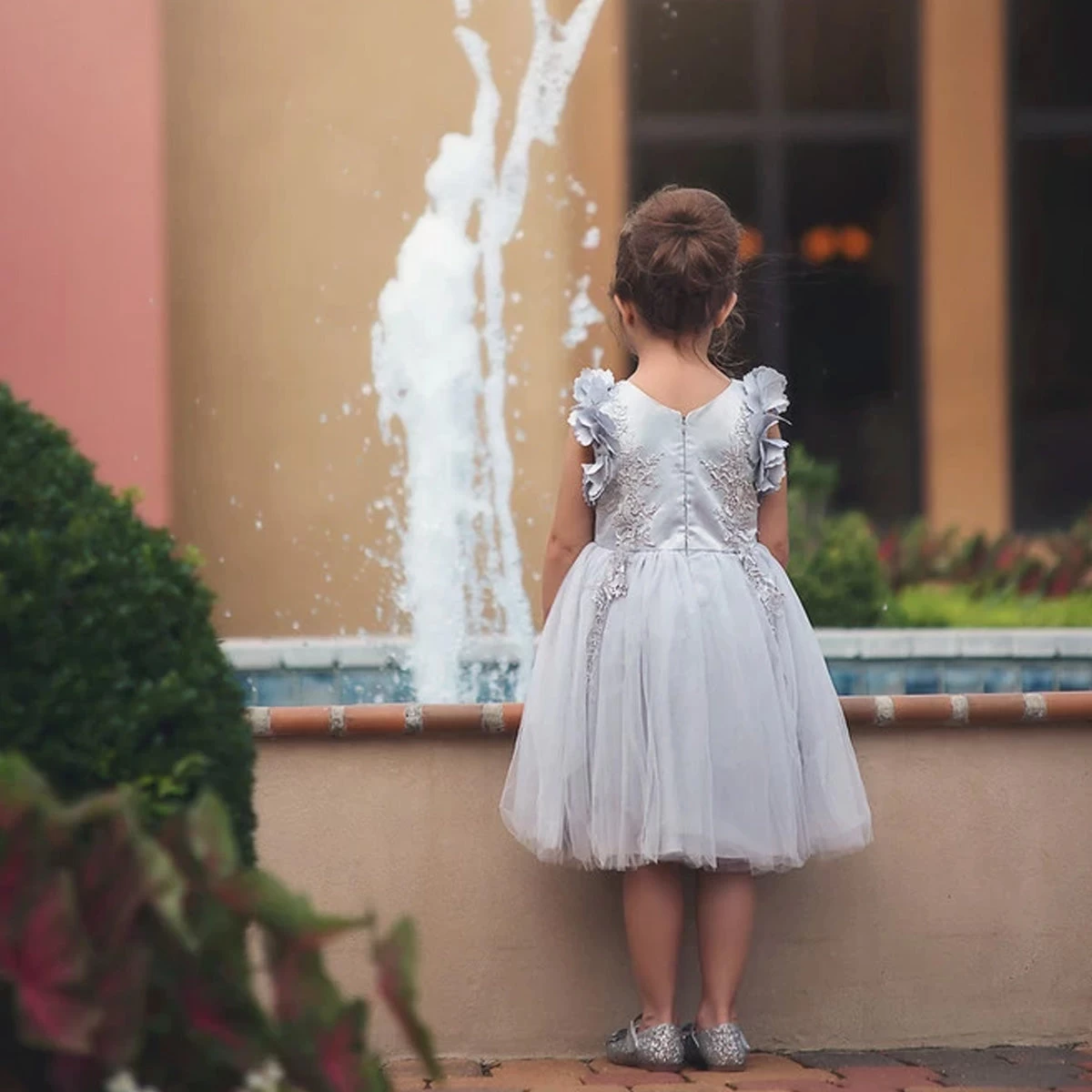 Fit for a princess, this dress has it all. Soft silver satin graced with a touch of lace, this dress is a showstopper! Sleeves are embellished with whimsical die cut flowers that will have all eyes on her. Tulling overlay skirt adds just the right touch of fullness and twirl. Fully lined with soft cotton, back zip. 100% poly self, 100% cotton lining. Machine wash, hang dry.