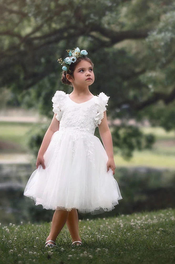 Fit for a princess, this dress has it all. Soft white satin graced with a touch of lace, this dress is a showstopper! Sleeves are embellished with whimsical die cut flowers that will have all eyes on her. Tulling overlay skirt adds just the right touch of fullness and twirl. Fully lined with soft cotton, back zip. 100% poly self, 100% cotton lining. Machine wash, hang dry.