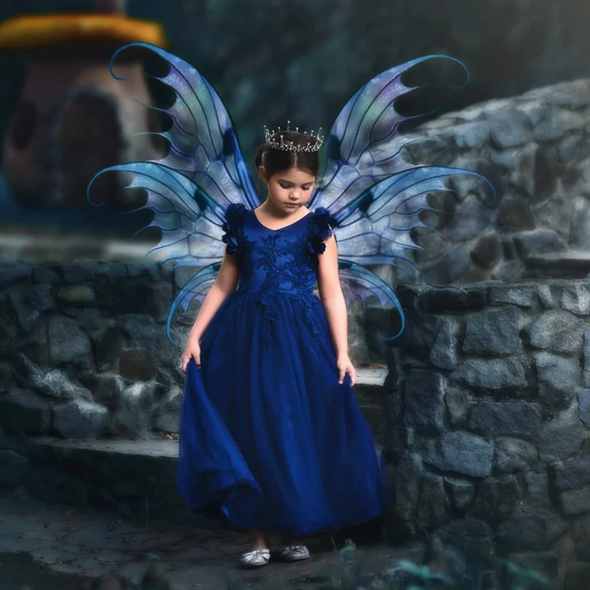Fit for a princess, this dress has it all. Regal navy satin graced with a touch of lace, this dress is a showstopper! Sleeves are embellished with whimsical die cut flowers that will have all eyes on her. Tulling overlay skirt adds just the right touch of fullness and twirl. This is a gorgeous full length gown. Fully lined with soft cotton, back zip. 100% poly self, 100% cotton lining. Machine wash, hang dry.