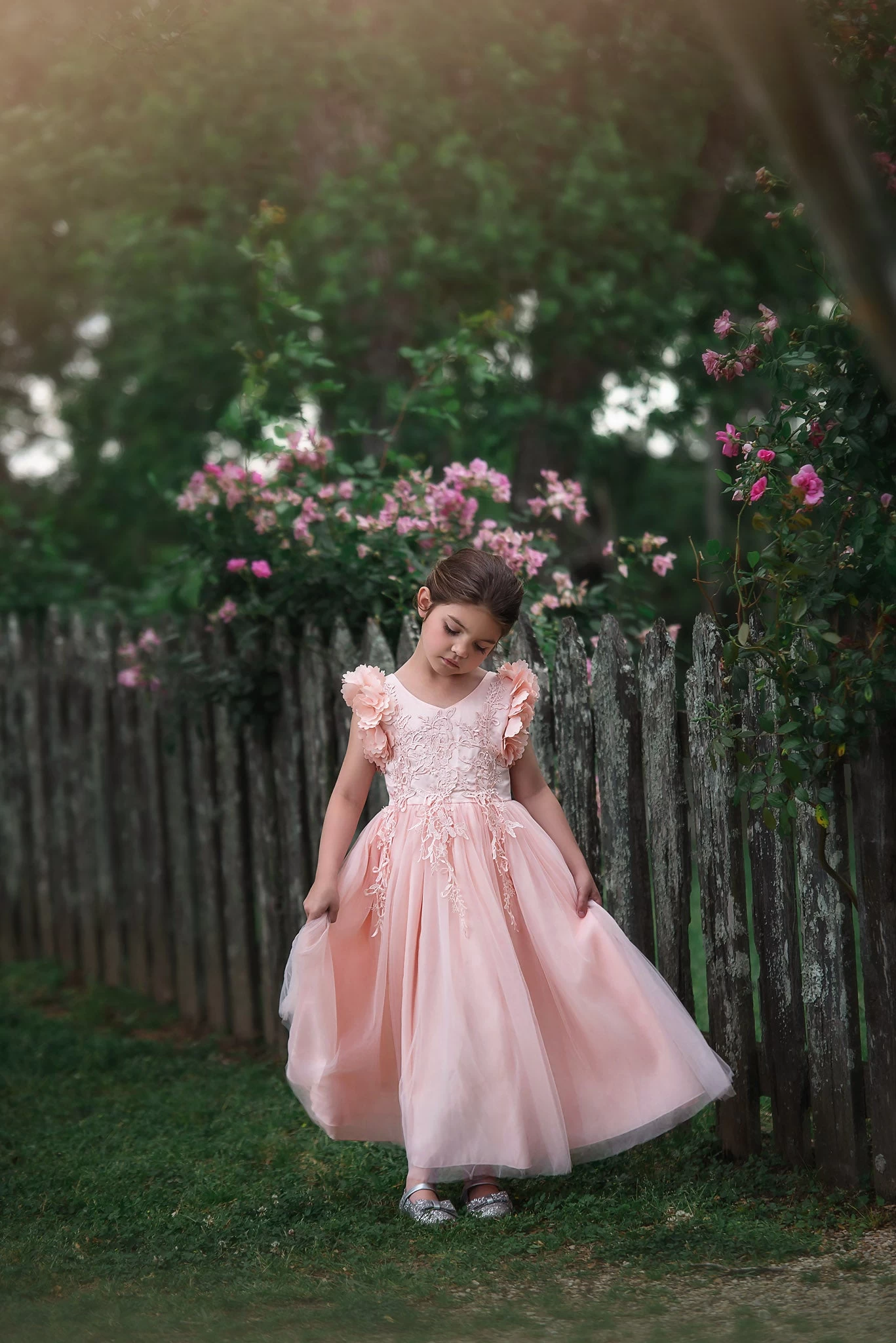 Fit for a princess, this dress has it all. Regal blush pink satin graced with a touch of lace, this dress is a showstopper! Sleeves are embellished with whimsical die cut flowers that will have all eyes on her. Tulling overlay skirt adds just the right touch of fullness and twirl. This is a gorgeous full length gown and incredible value for a gown of this caliber. Fully lined with soft cotton, back zip. 100% poly self, 100% cotton lining. Machine wash, hang dry.
