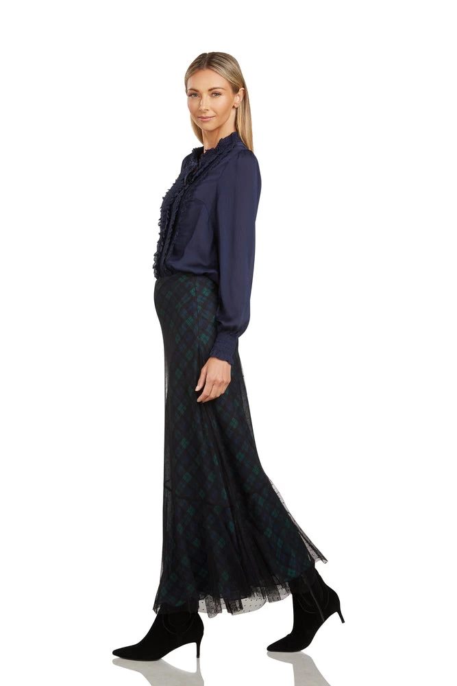 This elegant maxi skirt will be your go to skirt season after season! The tartan skirt is layered with a black dot mesh for just the right amount of movement.Â