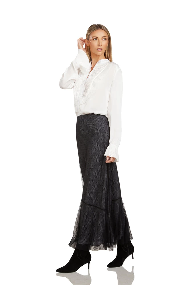 The Glenn plaid skirt is layered with a black dot mesh for just the right amount of movement.