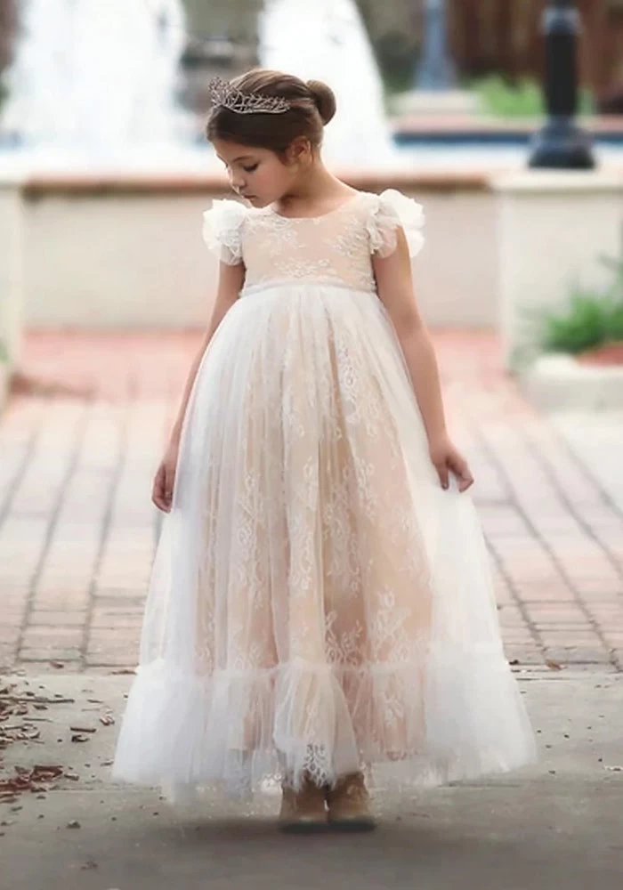 This stunning vintage lace gown will have all eyes on her! Our signature French inspired lace with eyelash trim is layered with tuling to create an oh so girly twirly frock! This gown is fully lined with soft cotton and our signature soft lace and fabrications are perfect for the most tactile sensitive child. She will never stop twirling! 100% poly self, 100% soft cotton lining. Machine wash, hang dry.