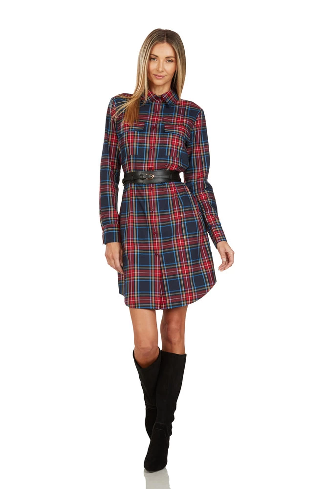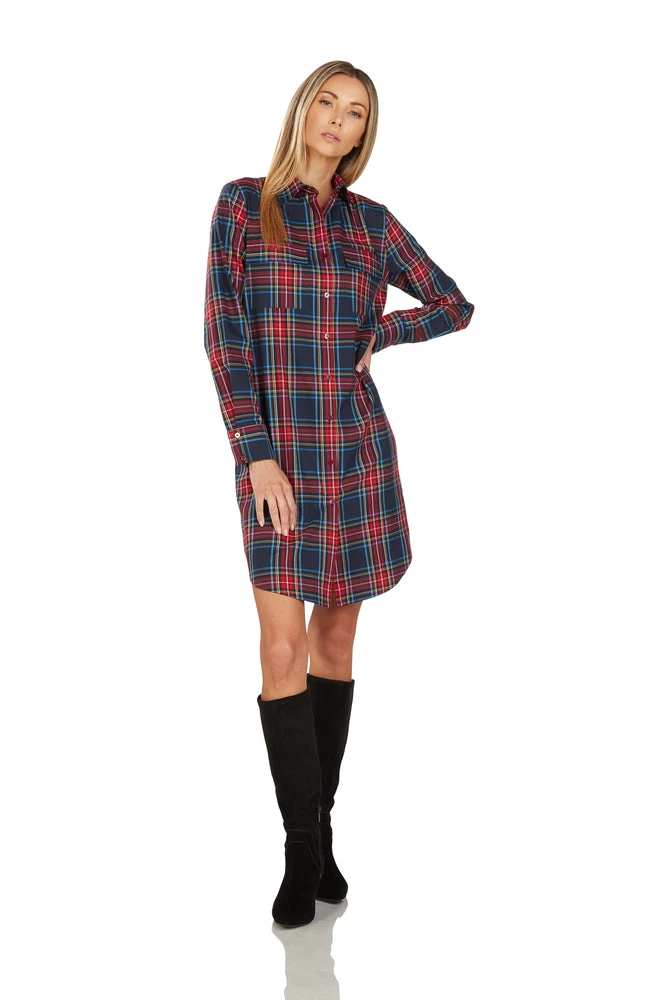 Comfort meets adorable in this chic Stewart tartan button front shirt dress.