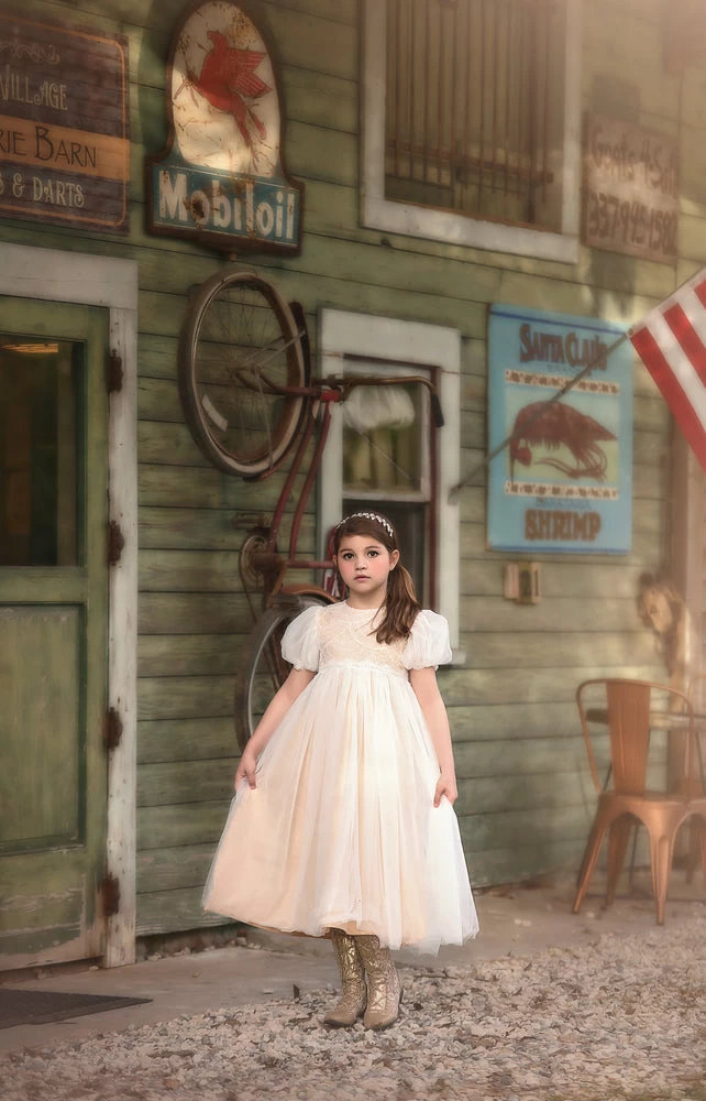 A little sparkle a little twirl, this gown has it all! Sequin and tulling scallops add just the right amount of sparkle to the bodice, a dainty poof finishes off the sleeve. The tulling skirt has a champagne lining for just the right touch of whimsy. This gown back zips and is fully lined with soft cotton. Machine wash, hang dry.
