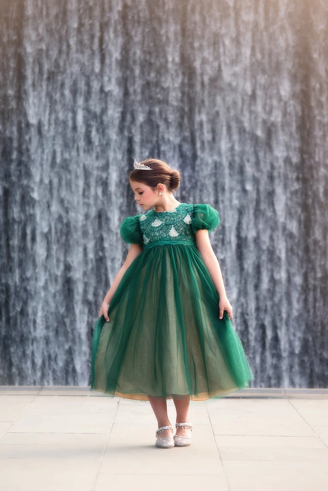 A little sparkle a little twirl, this gown has it all! Sequin and tulling scallops add just the right amount of sparkle to the bodice, a dainty poof finishes off the sleeve. The tulling skirt has a champagne lining for just the right touch of whimsy. This gown back zips and is fully lined with soft cotton. Machine wash, hang dry.