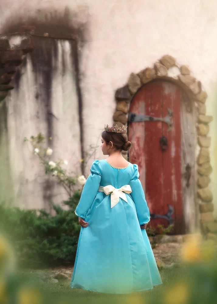 One of our most royal dresses to date, she will have so much fun wearing this one! Not a detail left untouched, the soft blue satin is graced with gold trimmings and flower detailing. The sleeves are pure royalty full of pomp and circumstance. This gorgeous gown self ties in back, for just the right fit! Fully lined with soft cotton, never itchy and like all of our products, NO glitter EVER!