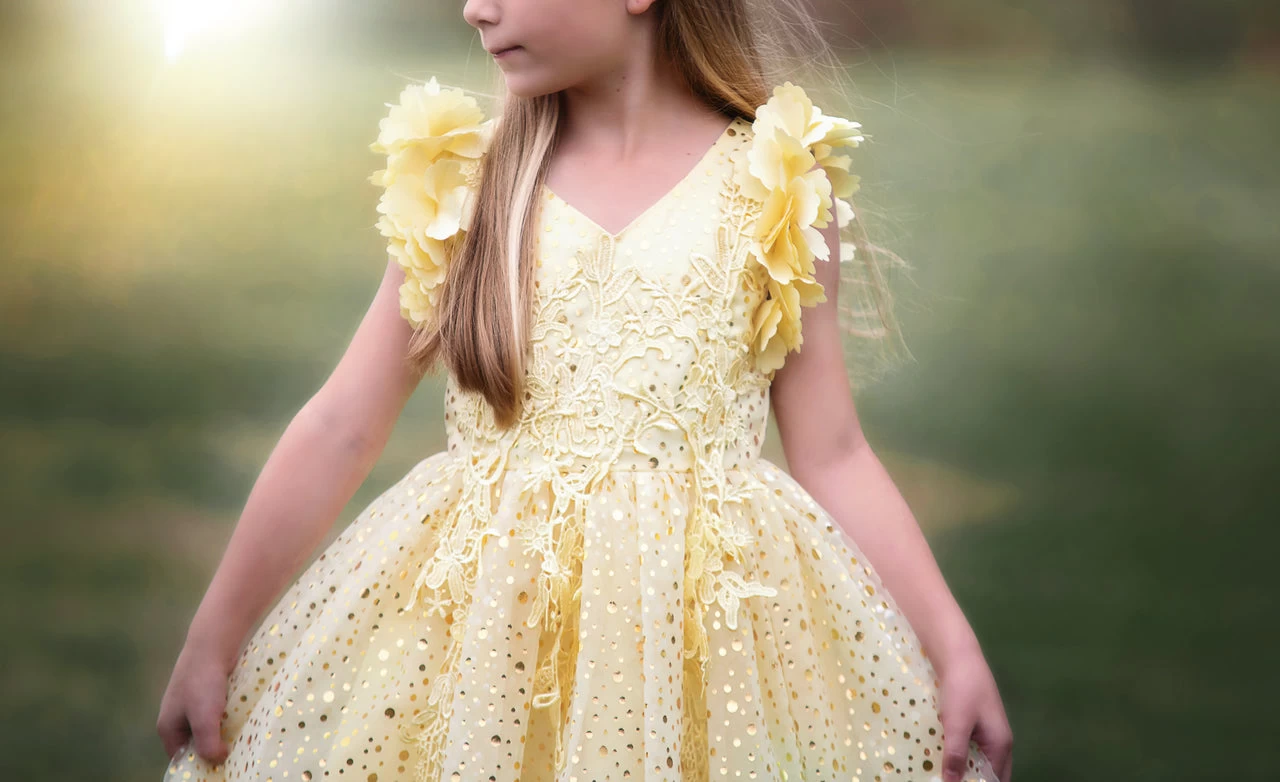 Fit for a princess, this dress has it all. Soft sunshine satin graced with a touch of lace, and shimmer dot mesh, this dress is a showstopper!