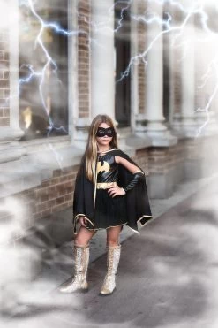 The Bat Queen has arrived and she’s oh-so-sassy. This darling 4-piece set features a dress, cape, glovettes and mask.